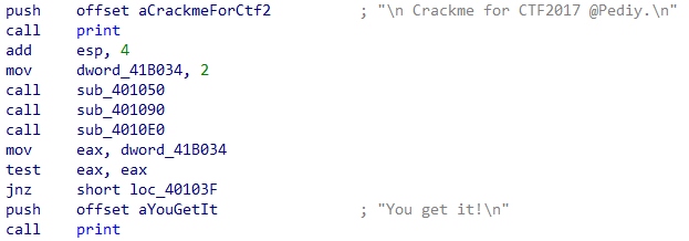 主函数很简单,显示打印欢迎界面,然后初始化dword_41B034为2,接着调用三个函数,当三个函数进行完之后,若dword_41B034为0的话,就打印"You get it!\n"