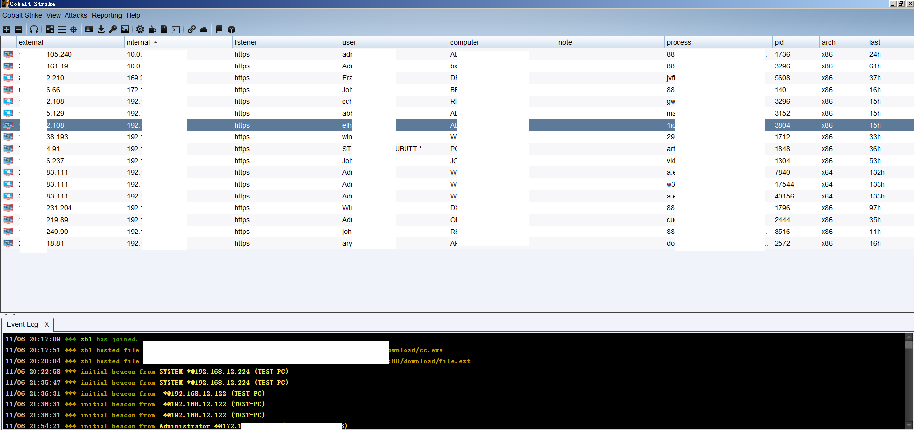通过一段时间的TeamServer通信密码暴破,我们进入到了Cobalt Strike的控制面板中(密码看起来并不弱,但实际上很弱)。